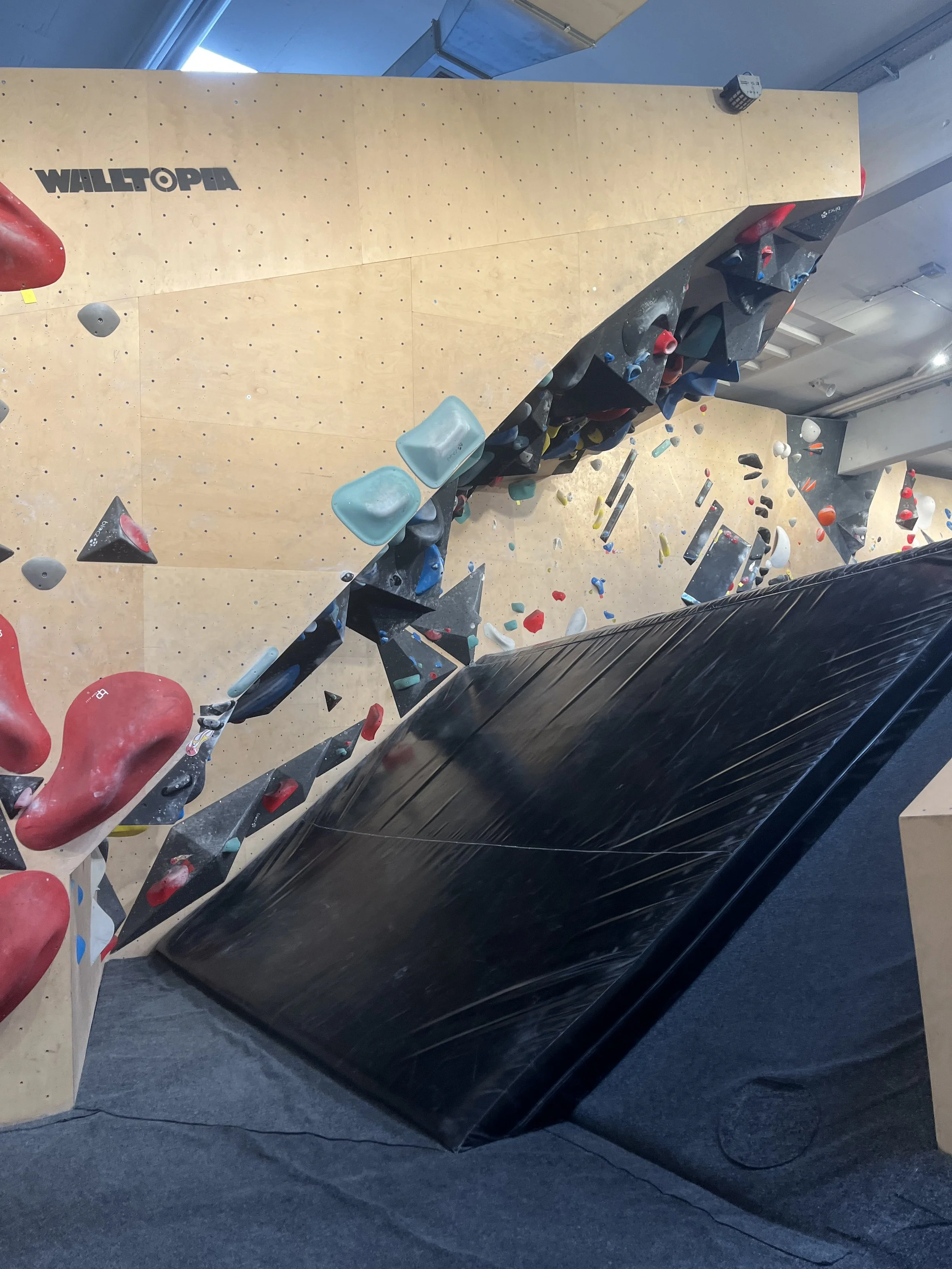In unserem Psychobloc kannst du über einer schrägen Matte fast 15 Meter lange klettern. Da man dort aber schräg hinunterfallen kann, darfst du dich nur auf der Matte darunter aufhalten, wenn du auch gerade dort kletterst.